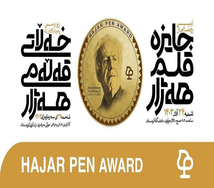 مراسم رونمایی از جایزه قلم هەژار، روز شنبه ۲۴ آذر ۱۴۰۳ ساعت ۹:۳۰ صبح در دانشگاه کردستان برگزار شد. این جایزه که توسط پژوهشکده کردستانشناسی دانشگاه کردستان و با همکاری و حمایت فعالان حوزه فرهنگی و ادبی تأسیس شده است، هر سال به کتابهای برتر در دو بخش نوشتن و ترجمه اهدا میشود. هدف این جایزه، تجلیل از آثار برجسته در حوزه ادبیات کردی، تحقیقات زبانشناسی و موضوعات میانرشتهای است.