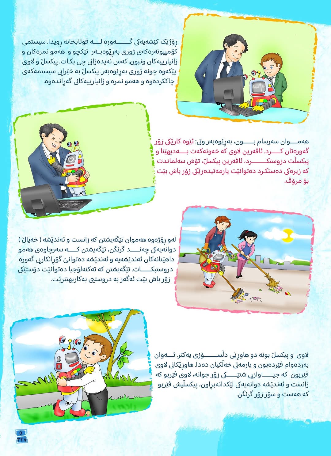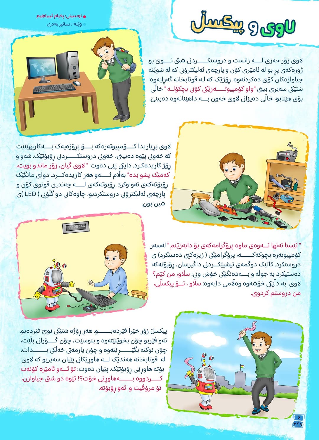 بر اساس اصول گفتارشناسی کودک (Child Discourse Analysis)، دیالوگها در داستانهای کودکانه باید پویا، طبیعی و منعکسکننده احساسات شخصیتها باشند. اما در «لاوی و پیکسل»، دیالوگها صرفاً نقش "انتقال اطلاعات" دارند و فاقد جذابیت احساسیاند. مکالمات بین شخصیتها بیشتر شبیه متنهای آموزشی مکانیکی هستند تا گفتوگوهای واقعی.جملات کلیشهای و فاقد تأثیرگذاری احساسی باعث شدهاند که خواننده نتواند به شخصیتها نزدیک شود.۵. پیام سطحی و کلیشهای بدون درگیری ذهنی بر اساس نظریه یادگیری ساختگرایانه (Constructivist Learning Theory) پیاژه، برای اینکه یک پیام در ذهن کودک ماندگار شود، باید از طریق "تجربه غیرمستقیم و درگیری شناختی" منتقل شود، نه با بیان مستقیم. اما در این داستان: